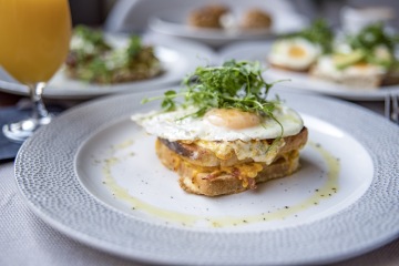 Tento úžasný sendvič je plněný šunkou od kosti a čedarem, a to je teprve začátek. Poté je pečený s créme fraiche, což mu dodává krémovou a lahodnou chuť. Na vrcholu toho všeho najdete sázené vajíčko s pažitkou, které dodává jídlo dokonalý závěr.