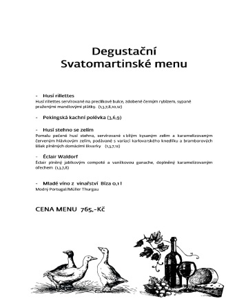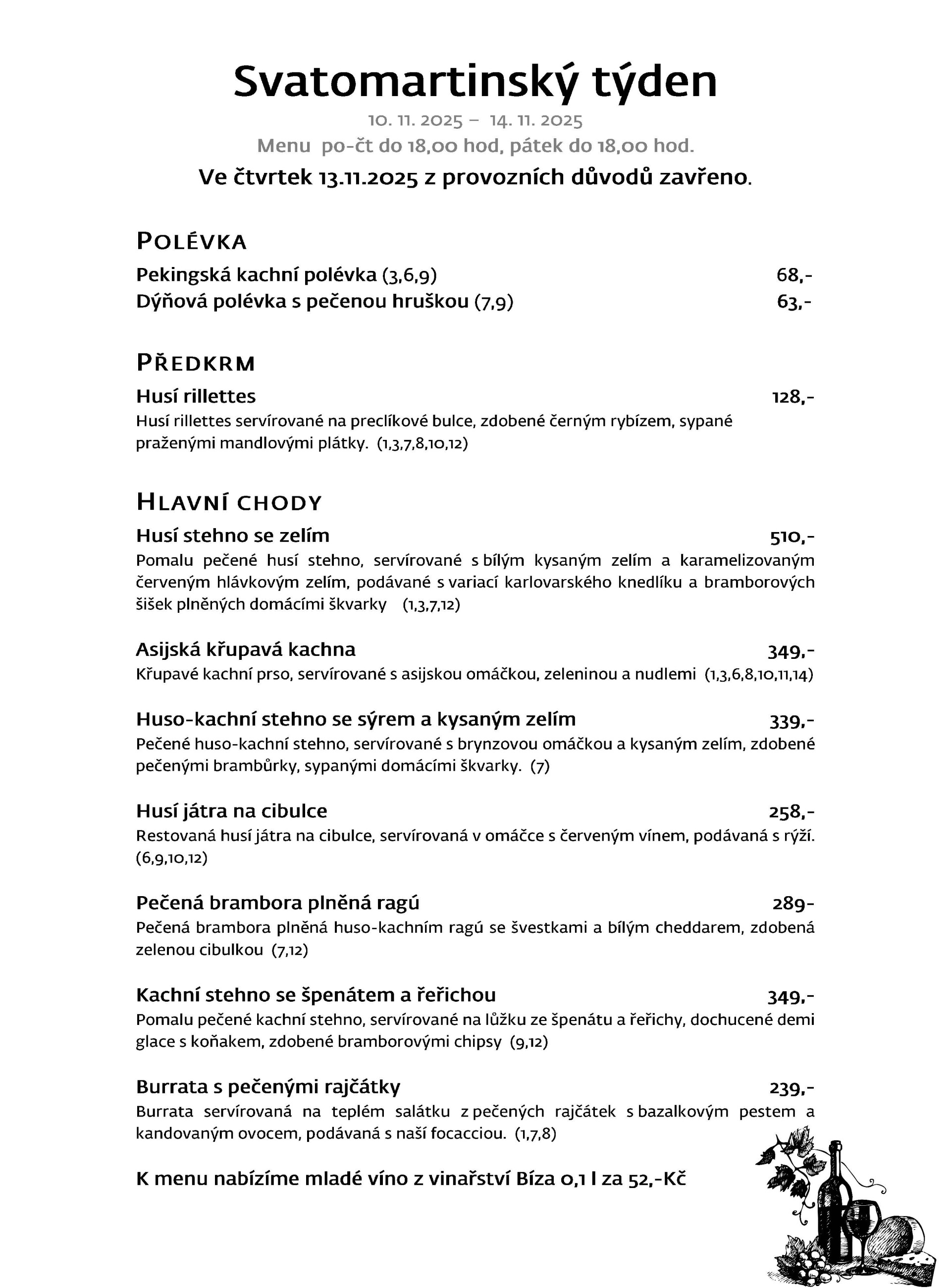 Husí a kachní speciality, vůně podzimu a jedinečná atmosféra — to vše přinese náš Svatomartinský týden 2025. Svatomartinské menu podáváme od 10. 11. do 14. 11. 2025.